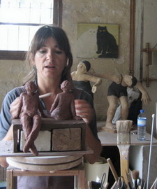 C'est à travers des personnages, le plus souvent en terre de grès, qu'elle fait passer ses émotions. Parfois émouvants, parfois drôles, quelques fois impressionnants, comme en attente d'adoption, ils touchent celui qui les regarde. Derrière cet art presque brut, presque naïf, elle a élaboré , au fil des ans, une technique qui lui permet de réaliser des pièces de grande taille. La réalisation en bronze de certaines sculptures leur confère une intensité supplémentaire et met en exergue les caractéristiques de son art.